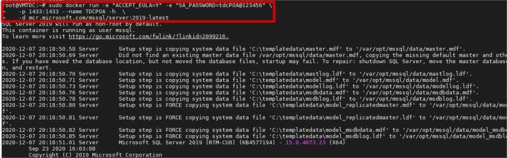 sudo docker run -e "ACCEPT_EULA=Y" -e "SA_PASSWORD=tdcPOA@123456" \