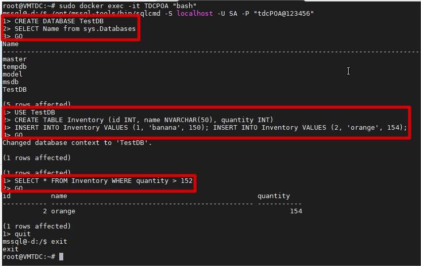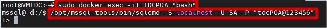 1º: sudo docker exec -it TDCPOA "bash" 2º: /opt/mssql-tools/bin/sqlcmd -S localhost -U SA -P "tdcPOA@123456"