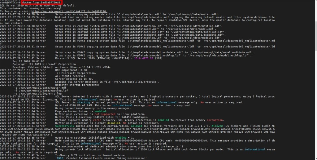 Para acessar as logs do SQL Server, basta você pegar o ID do seu container (você tem essa informação com o comando “docker ps -a”) e digitar (Figura 04):