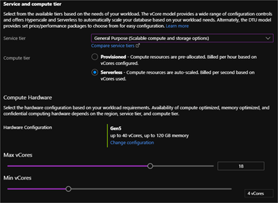 O modelo vCore se aplica ao Serverless, mas de uma maneira diferente, você escolherá um intervalo de vCores que inclui um valor mínimo e máximo.