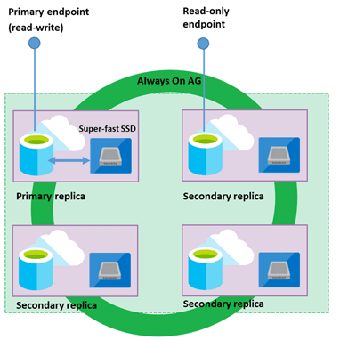 - Alta disponibilidade integrada com réplicas usando AlwaysOn Availability Groups, incluindo a opção de read scale-out (possui 1 réplica somente leitura);