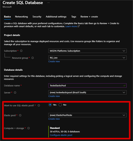 Criação de um Elastic Pool: