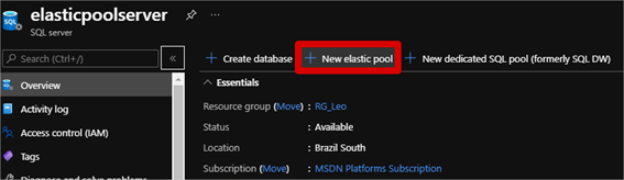 Caso deseje criar um Elastic Pool a partir de um servidor de banco de dados já existente, dentro do seu Servidor de Banco de Dados clique em New elastic pool conforme abaixo: