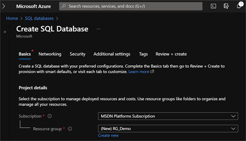 Na primeira tela devemos escolher a Subscription e Resource group que será utilizado, caso não vá utilizar um RG já existente você pode criar um novo clicando em Create new.