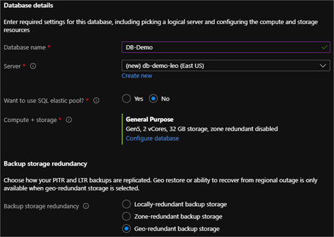 Ainda na primeira tela, logo abaixo temos as opções Database details onde devemos definir o nome do nosso Banco de Dados e o Servidor dele, se vai ser utilizado um já existente ou criar um novo, para criar um novo é só clicar em Create new.