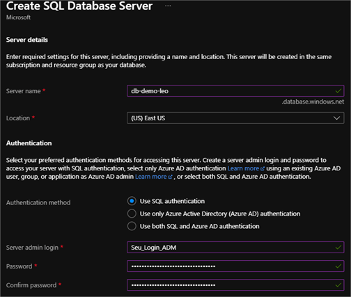 - Allow Azure services and resources to access this server: Marcando essa opção como Yes vamos permitir que serviços do Azure como Storage Account, Backup, entre outros possam se comunicar com o SQL Database.