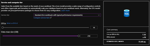 Para esse exemplo vamos utilizar DTU’s utilizando o modelo Standard S1 com 250GB de armazenamento, após selecionar é só clicar em Apply.