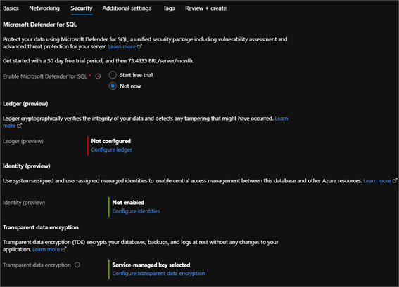 Vamos deixar o Azure Defender desabilitado, portanto deixe marcado como Not now, aqui também é possível configurar a feature de TDE (Transparent Data Encryption) para o seu Azure SQL Database.