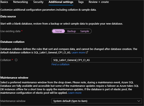 Database collation: é onde você define a Collation do seu banco de dados, vamos usar o padrão que está, porém caso sua aplicação tenha um requisito de Collation específica aqui é o momento de fazer esse ajuste!