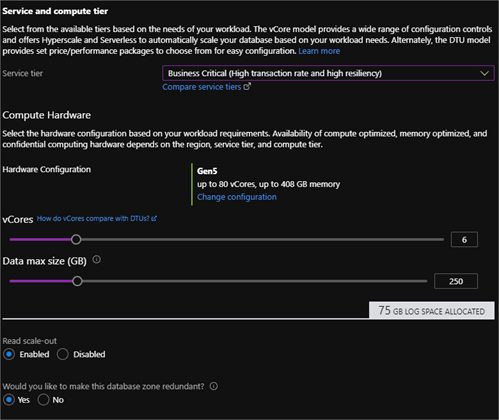 Com a opção Business Critical selecionada, temos a possibilidade de ajustar nossas configurações de Hardware conforme abaixo: