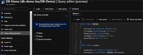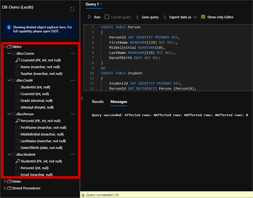 Após a execução da query, dei um Refresh e expandi na barra lateral a opção Tables que mostra as tabelas do nosso banco, conforme print abaixo podemos verificar a criação das tabelas com todos seus atributos relacionado ao código executado no Query editor no Azure SQL Database.